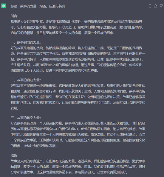 故事的力量无处不在,它可以在我们的生活中留下深刻的印记,也可以在我们的心灵中留下永恒的记忆。好的故事可以帮我们更好地表达和沟通,可以触动心灵、启迪智慧;好的故事可以改变一个人的命运,可以展现一个民族的形象。我们应该学会欣赏和传播好的故事,让它成为我们生活中的一部分。