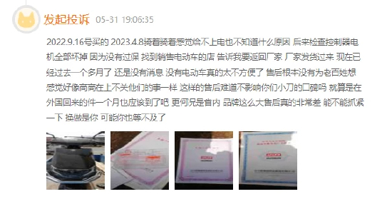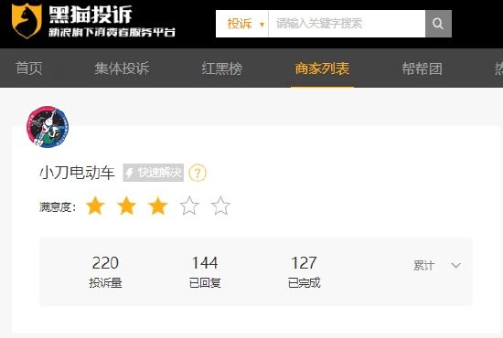 根据黑猫大数据中心统计,截至发稿黑猫投诉平台共收到针对小刀电动车投诉220单,回复率65.45%,不少用户投诉购买的小刀电动车存在质量问题。由用户反馈称购买的小刀电动车不到一年控制器电机损坏,返厂维修一个月还未修好。
