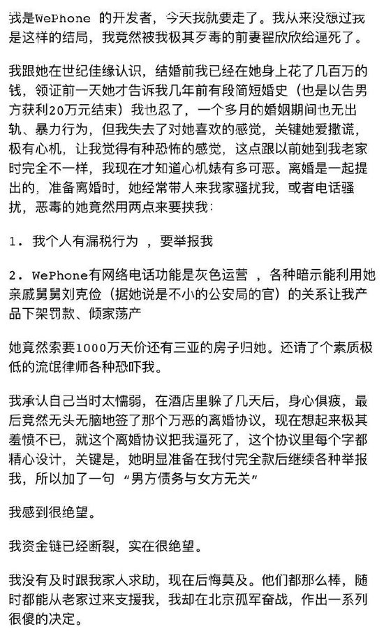 他留下遗言,表示自己被前妻翟欣欣威胁索要千万财产,走投无路而自杀。
