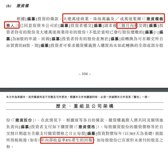 其次是上市对赌。珠海万达需要在投资者递交撤资申请后的三个月内在H股上市,如果不能的话,撤资权义务人就需要回购股权,并给予投资对价8%的年内部收益率作为补偿。
