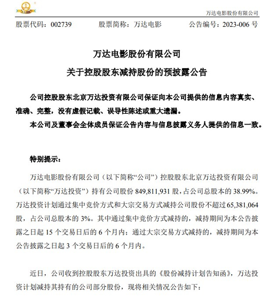 4月19日,万达电影公告称,控股股东万达投资因自身资金需求,计划通过减持公司股份不超过6538万股,占公司总股本的3%,市值约9.53亿元,6个月内减持完毕。