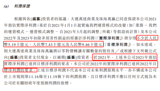 首先是利润要求。珠海万赢、大连万达商管承诺珠海万达商管2021-2023年实际净利润分别不低于51.9亿元、74.3亿元及94.6亿元。如未达成,大连万达商管及珠海万赢将以零对价转让有关数量的股份,或向投资者支付现金补偿。