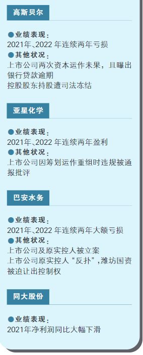 例如,2021年一季度在巴安水务流动性危机加剧之际,山东高创以“白衣骑士”的身份前来救场。彼时,经过一系列安排,巴安水务原实际控制人张春霖同意将上市公司控股权转交给山东高创,但同时明确提出让山东高创协助上市公司解决“17巴安债”的偿还问题。然而,山东高创花费3.37亿元入股巴安水务后,虽采取了一些积极帮扶举措,但仍无法扭转上市公司大额亏损、债务累累的局面,其与张春霖之间的矛盾分歧也日益显现,双方阵营在董事会席位上展开了争夺。无奈之下,山东高创最终交出了上市公司控制权。“公司目前就是无实控人状态。”巴安水务相关人士日前告诉记者。