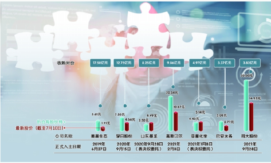 时至2021年,潍坊国资又相继入主了高斯贝尔、亚星化学、巴安水务、同大股份等4家上市公司。记者统计发现,潍坊国资收购上述7家上市公司合计耗资约60.53亿元。