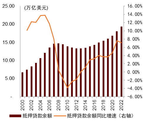 利率下行环境中,再融资活跃,可减轻房贷负担同时也可稳定按揭贷款规模。当利率下降时,存量固定利率房贷利息成本上升,美国居民可以通过再融资实现低息贷款置换存量高息贷款,减轻还贷压力。一般在30年按揭贷款固定利率下降阶段,再融资指数上升,再融资贷款比例上升。此外,再融资政策也有助于稳定按揭贷款规模,比如2020-2021年提前还款率大幅上升期间,美国按揭贷款同比增速仍为正,在5%-8%区间,并未出现按揭贷款规模下降的情况。