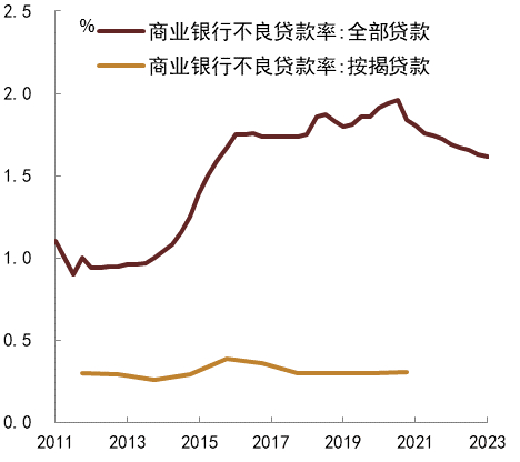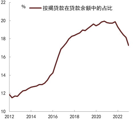 个人按揭贷款在银行贷款中占比较大。按揭贷款是银行信贷投放的重要渠道,在银行贷款中占比较大,2017年一季度新增按揭贷款在新增贷款中的年化占比最大曾超过40%,2020年年底按揭贷款余额在银行贷款余额中占比达20%。随着房地产销售放缓以及提前还贷规模上升,新增按揭贷款在新增贷款中的占比快速下降,2022年全年按揭贷款在新增贷款中的占比只有2.3%,按揭贷款在贷款余额中的占比也降至18%附近。