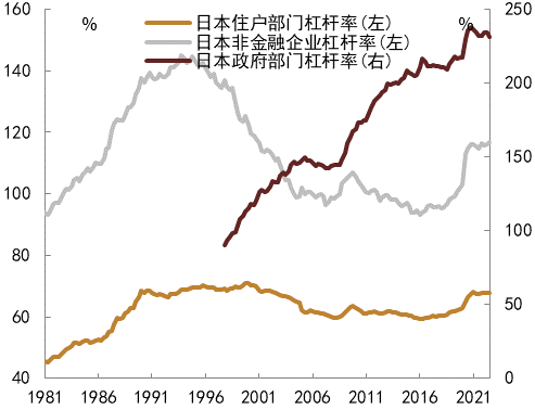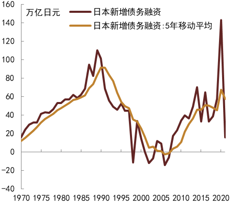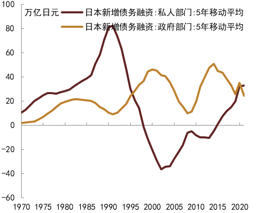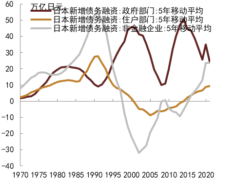 日本政府部门加杠杆,但是整体融资增长放缓。为应对经济下行压力,在房地产下行而私人部门去杠杆过程中,日本政府则进入到长期加杠杆过程,政府部门融资持续处于相对高位。不过,尽管政府部门融资上升,但是私人部门融资收缩速度更快,日本全社会融资整体仍呈现下降走势,日本非金融部门新增债务融资规模从1989年的110万亿日元附近降至1996年的45万亿日元,之后甚至降至0附近。