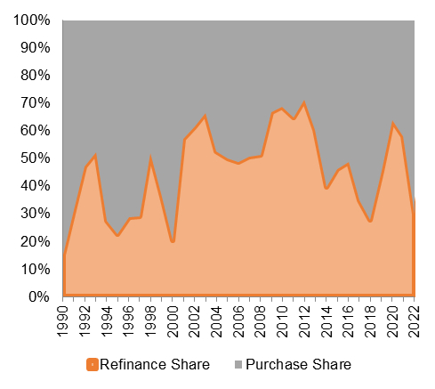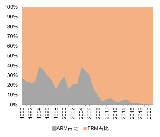 美国按揭贷款主要为固定利率,存在灵活的再融资机制。2007年美国房地产泡沫破灭之后,固定利率贷款(fixed-rate mortgage,FRM)比浮动利率贷款(adjustable-rate mortgage,ARM)更为普遍。ARM在按揭贷款发放总额中的占比从2005年年中接近45%下降到2009年年中的2%。按照贷款性质,美国住房按揭贷款可以分为购房贷款(Purchase)和再融资贷款(Refinance)。美国按揭贷款再融资类型主要有无现金再融资(No cash-out refinance)和现金再融资(Cash-out refinance)。无现金再融资主要是为按揭贷款的未偿余额再融资,这也是最常见的再融资类型。现金再融资主要是用于房屋升值较多的情形,再融资金额可能超过按揭贷款未偿余额,差额可以用于装修或者改善财务状况等,通常贷款利率会更高。