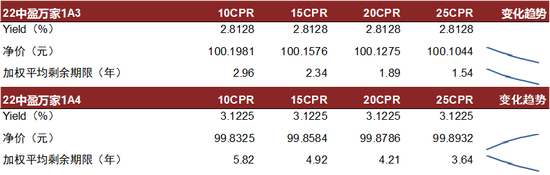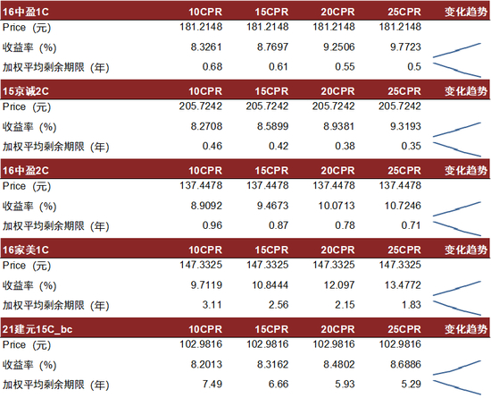 固定摊还个券基本无影响。固定摊还个券按照固定的摊还计划偿付本息,在提前还款率没有大幅超预期的情况下,均能按照计划偿付。我们测算在10%(发行说明书假设)、15%、20%和25%(历史最高)年化早偿率情况下净价和加权期限均无变化。