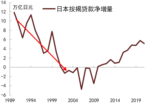 日本居民提前还贷导致银行贷款增长放缓。日本第一次提前还贷过程中,虽然利率下降幅度较大,住房贷款偿还率较高,但是房地产仍处于上行阶段,居民对房地产市场预期仍然良好,这个时期有大量的按揭贷款提前偿还,同时也有大量的住房贷款新增,我们注意到从1981年到1987年,日本银行贷款仍在增长。不过第二次提前还贷的情况则不同,由于这个过程是伴随房地产价格进入下行阶段,在按揭贷款大量偿还的同时,新增的按揭贷款规模却有限,这就导致按揭贷款净增量持续下降。根据日本住宅金融支援机构的统计,日本按揭贷款净增量从1994年的11.4万亿日元持续降至2002年的-1.3万亿日元,1993年-2012年日本城市银行贷款余额呈现持续下降趋势。