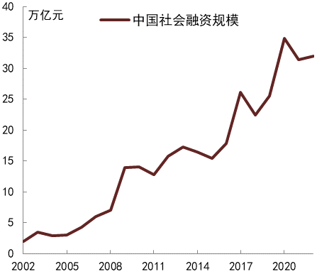 我国社会融资增长长期或有趋缓可能。当前我国房地产市场逐步趋弱,居民加杠杆意愿下降,我国私人部门杠杆率增长也可能趋缓。2020-2022年我国每年新增社会融资规模都超过30万亿元,我们认为如果后续房地产市场趋弱,居民按揭买房规模下降,我国社会融资增长长期可能有所趋缓。