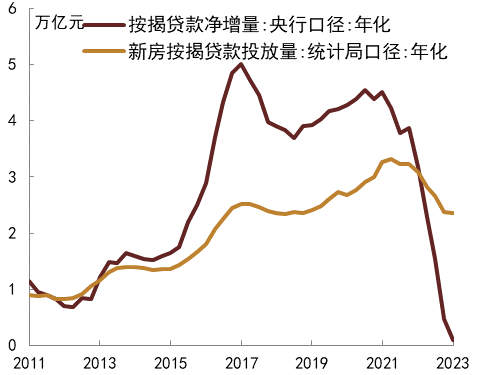按揭贷款下降主要是受提前还贷影响。当然按揭贷款下降是受按揭贷款投放减少和提前还贷的共同影响的,那么如何确认按揭贷款下降的主要原因不是按揭贷款投放减少呢?我们认为一个比较好的视角是观察央行口径和统计局口径按揭贷款数据的相对变化。央行口径公布的按揭贷款是全口径的净增量数据,而统计局口径公布的是开发商角度统计的新房按揭贷款的投放量数据,二者的差异主要来自两部分,一部分是二手房相关按揭贷款,一部分是贷款偿还,当然也包括提前还贷。我们注意到今年统计局口径下的按揭贷款投放虽然也有所下降,但是降幅相对有限,而央行口径下按揭贷款净增量则是大幅下降的,考虑今年二手房销售相对恢复正常,那么二者差异或主要体现为提前还贷影响。
