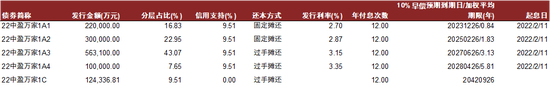 我们以最新一单一级发行的产品22中盈万家1为例,该产品分为A1-A4,包括固定摊还和过手摊还两类证券类型。