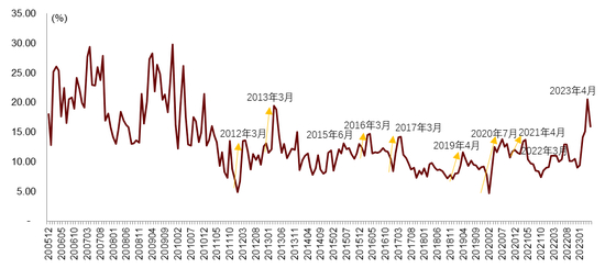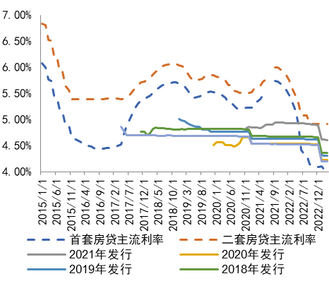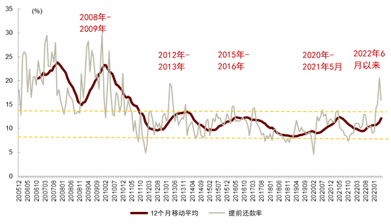 从12个月移动平均的历史中枢来看,我们认为提前还款走势尚未超预期。从12个月移动平均来看,提前还款率走势仍然相对平稳。历史上升周期大致有以下几个阶段:(1)2008年金融危机,早偿率大致在15%-22%;(2)2012-2013年,2015-2016年,2020年,2022年6月以来,整体波动范围在8%-13%区间。