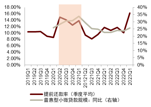我们认为短期内提前还贷可能有所放缓。经历前期的大规模提前还贷之后,短期提前还贷可能不会再冲新高。数据上看,2023年5月RMBS资产池数据显示的早偿率已经回落到16%左右。趋势上看,历史上,提前还款上升趋势一般在3-6个月左右回落,比如2017年1月-2017年4月、2018年2月-2018年4月、2019年1月-2019年4月、2020年2月-2020年7月、2021年2月-2021年4月、2021年11月-2022年4月、2022年5月-2022年8月、2023年1月-2023年4月。此外近期普惠型小微贷款的增速相对平稳,在监管趋严的态势下利用消费贷、经营贷置换房贷的行为较前期可能有所减弱。