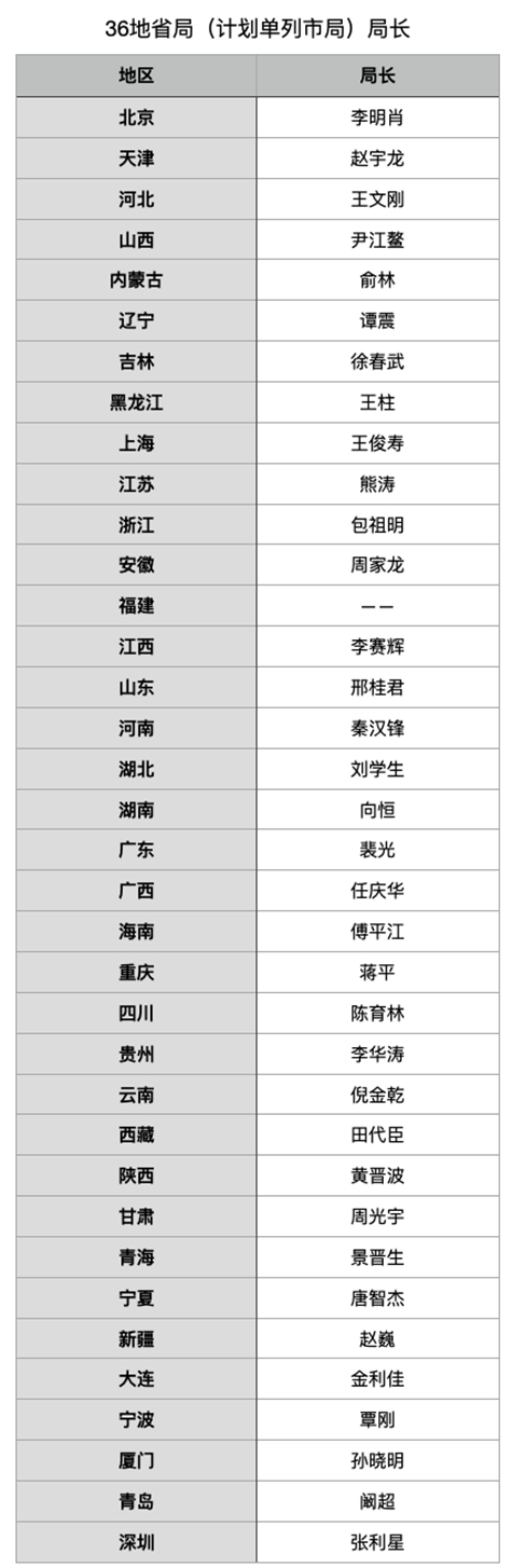 截至目前,36家省局在任局长仅福建监管局局长空缺,原局长丛林自2022年12月赴任原银保监会副主席,现任国家金融监督管理总局党委委员、副局长。以下是清单: