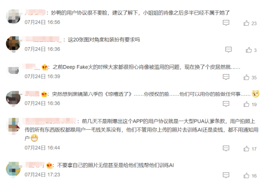 这引发了不少用户的反弹,“不要拿自己的照片无偿甚至是给他们钱帮他们训练AI”,“妙鸭的用户协议很不要脸,建议了解下,小姐姐的肖像之后多半已经不属于她了。”