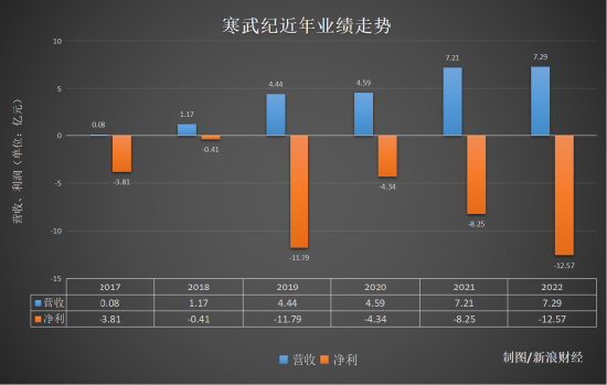 2022年度,寒武纪实现营业收入7.29亿元,较上年同期仅增长1.11%;实现净亏损为12.57亿元,较上年同期的净亏损8.24亿元扩大4.3亿元。