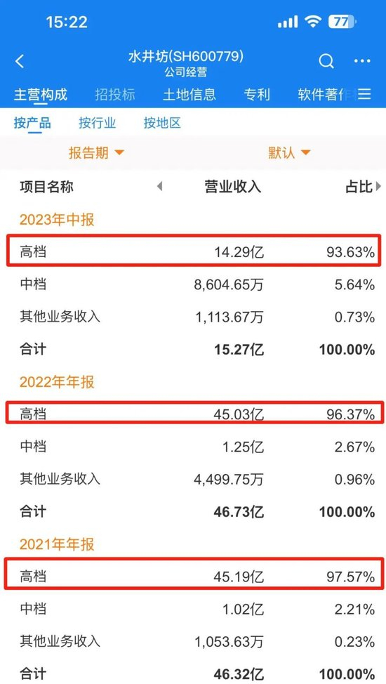 然而,2022年以来高档产品营收占比持续下滑,而且在库存压力下,水井坊很有可能面临“价格倒挂”的风险。