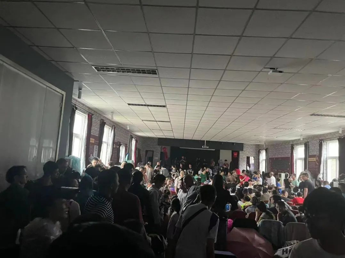 汗味儿、脚臭味儿、霉味儿搅和在一起,温宇被“熏得头晕”。室内的椅子被抢占一空,讲演台上睡满了打地铺的乘客。几乎所有人都表情木然,“累得不想说话”。