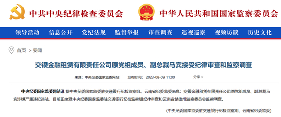 8月9日,中央纪委国家监委官网通报显示,交银金融租赁有限责任公司原党组成员、副总裁马宾涉嫌严重违纪违法,接受纪律审查和监察调查。