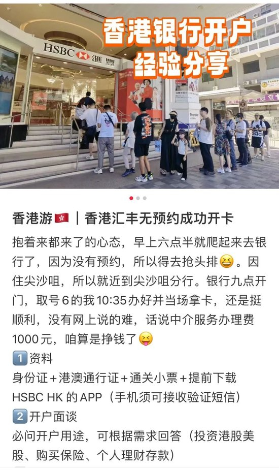 不过,目前内地居民赴港开户也并不容易。“要么排队的时间很长,需要早上7点就去取号,要么可能会被要求很多证明文件。找代理商帮忙开户要花几千块,给我报的价格是汇丰开户是2680元,中银香港开户是3980元。“北京的李女士告诉界面新闻记者。