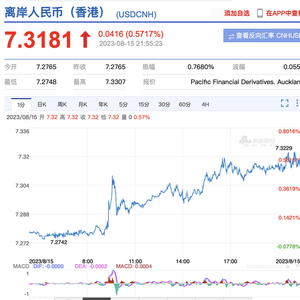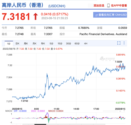 8月15日早间,受超预期“降息”影响,离岸人民币对美元突破7.31关口,跌至7.3110,日内贬值逾300点,随后,又迅速拉升,较日内低点拉升逾200点,一度收复7.29关口。再后,离岸人民币在7.3附近持续波动,截至发稿,离岸人民币兑美元日内跌幅最高超500点,达7.33。