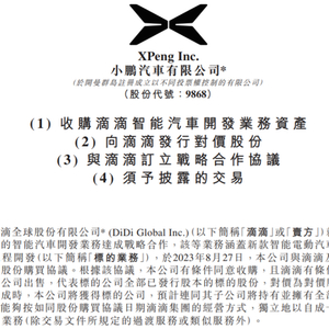 这是一笔不涉及现金的交易,小鹏通过增发股份的方式来收购滴滴资产,滴滴则通过出卖资产获得小鹏汽车的股份。此外,双方还签订有对赌协议,双方合作的新车量产之后,滴滴在出行体系内卖得越多,就有机会获得更多小鹏汽车的股份。