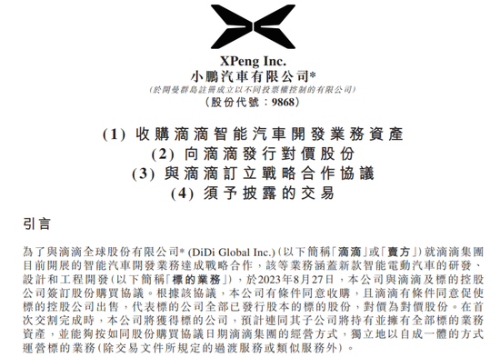 8月28日,小鹏汽车发布公告称,以最高对价港币58.35亿港元的价格,收购滴滴智能汽车开发业务资产。