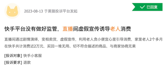 如何维权也是一大难题。在黑猫投诉平台上,也有不少消费者反映,家里的老人从情感主播的直播间买到假冒伪劣的玉器、摆件或饰品,自己想要退款时经常遇到“没人管”的情况,不仅商家敷衍了事,平台的官方客服也很难及时响应。