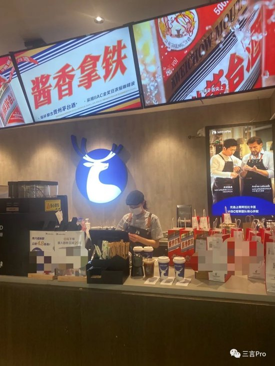 不过,虽然瑞幸主打和茅台联名,但今天笔者去的几家门店里,并没有摆放茅台酒瓶。只是一些宣传物料、包装袋、杯托等,采用了茅台的经典设计样式。