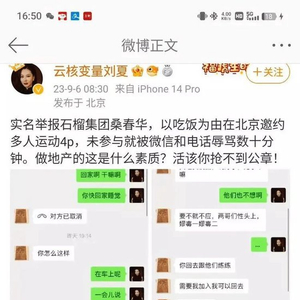 9月6日,云核变量集团CEO刘夏公开实名举报地产圈石榴集团桑春华,揭露其在微信上邀请4P“多人运动”的不良行径。