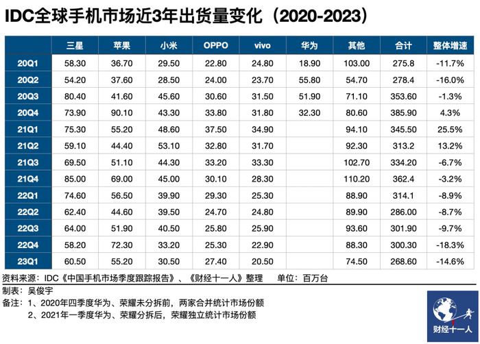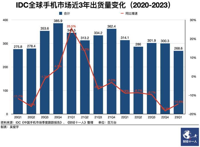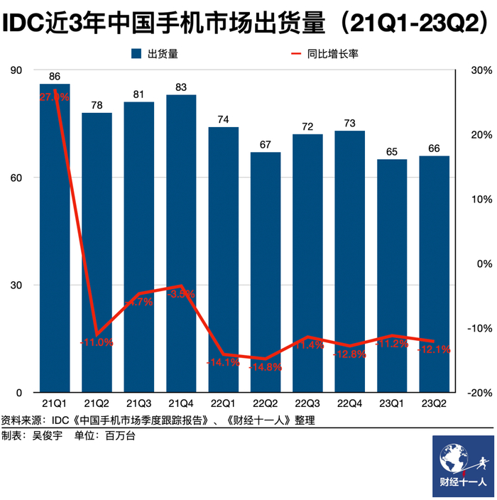 这和总体市场大盘在缩小的现状有关。IDC预测,2023年全球与中国市场的智能手机出货量都会再度下滑,分别下滑4.7%和1.1%,双双再创十年新低。2024年,全球手机市场才有望恢复增长,但未来五年内都只会维持较低的个位数增长。