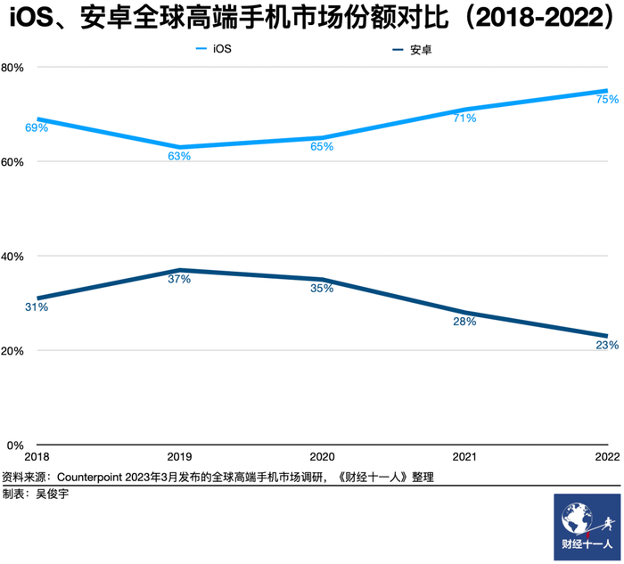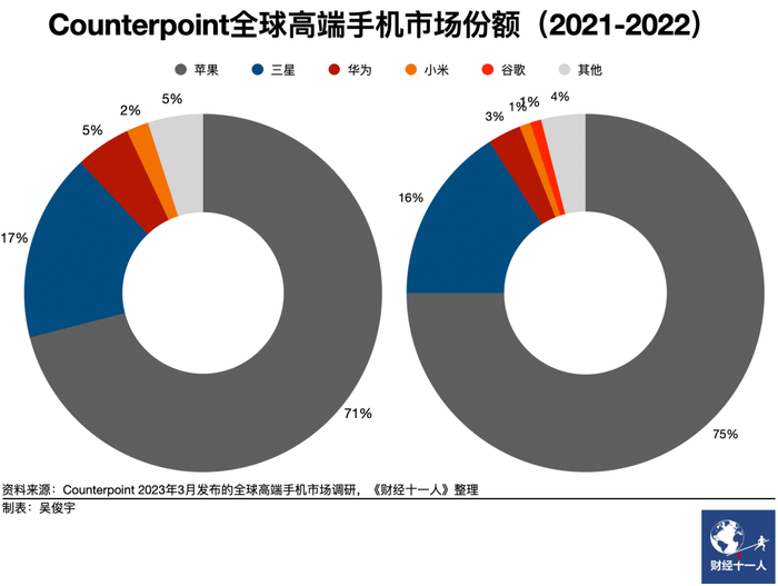 事实上,过去三年国产手机厂商吞下的主要是华为的中低端市场,华为在高端市场上的真正对手是苹果。另一家第三方市场调研机构Counterpoint数据显示,2020年全球高端手机市场中,苹果占比55%,华为为13%;到了2022年,苹果的份额膨胀至75%,华为仅余3%。相对而言,三星的份额波动不大。