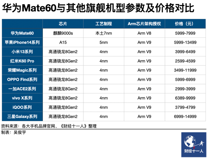 华为Mate 60 Pro搭载了自研的麒麟9000S芯片,采用国产7nm先进制程工艺。一位手机芯片从业者评价,虽与苹果、高通的4nm芯片相比仍有一个代际的差距,但由于旗舰手机普遍性能过剩,7nm工艺也能满足绝大多数用户的需求。
