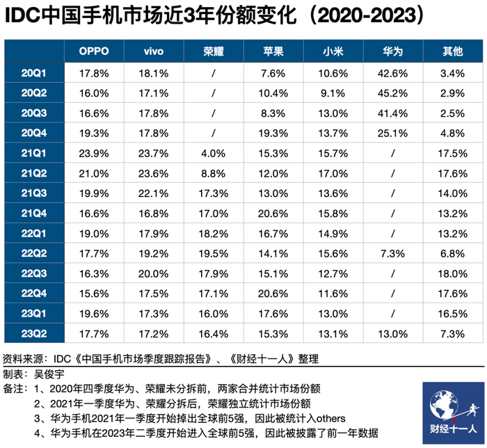 多位行业受访者对《财经》表示了相似的看法,华为手机全面回归后,小米、荣耀将最有危机感。前者是由于与现阶段华为的市场份额咬得最紧,随时可能被挤出前五;后者则是与华为的重合度更高。OPPO、vivo近两年一直在高端市场发力,中低端市场相对平稳。