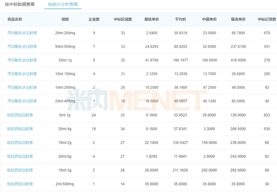 从全国最低中标/挂网价看,20ml:200mg、50ml:500mg、50ml:1g、10ml:100mg、10ml:200mg、20ml:400mg的丙泊酚乳状注射液分别为2.84元/支、24.63元/支、41.87元/支、2.12元/支、10.2元/支、18.58元/支;而5ml:1g、20ml:4g的吡拉西坦注射液全国最低中标/挂网价已低于1元/支。