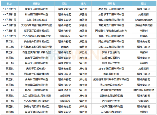 在国家开展的七批八轮化药集采中,神经系统化药分别有6个、2个、10个、8个、3个、8个、3个品种被纳入其中,合计40个品种(不含落标品种)。其中,精神安定药、精神兴奋药首当其冲,累计纳入集采品种数均超10个。