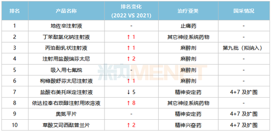 10个产品中,丁苯酞氯化钠注射液、注射用盐酸瑞芬太尼、依达拉奉右莰醇注射用浓溶液涨逾10%,排位较2021年分别提升1个位次、2个位次、8个位次,其中丁苯酞氯化钠注射液、依达拉奉右莰醇注射用浓溶液均为国产创新药。