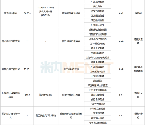 在2022年神经系统化药产品排名中,丙泊酚乳状注射液排位第三,由Aspen(43.39%)主导市场,目前该产品已有6家企业过评/视同过评。