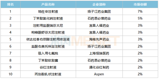 品牌TOP10中,9个为国产品牌,扬子江药业、人福药业、石药集团均有2个品牌上榜,其中扬子江药业的地佐辛注射液稳居榜首,人福药业2款麻醉剂分别位列第三、第四;海南先声药业的1类新药依达拉奉右莰醇注射用浓溶液大涨73.75%,排位第五。