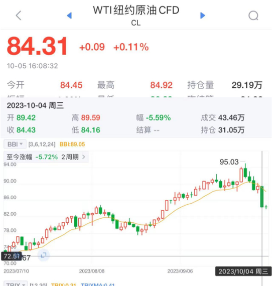 国际油价周三(4日)重挫超过5%,美国WTI原油期货11月合约结算价收跌5.61%,报84.22美元/桶,创去年9月以来最大单日跌幅;布伦特原油期货12月合约结算价跌5.62%,报85.81美元/桶。