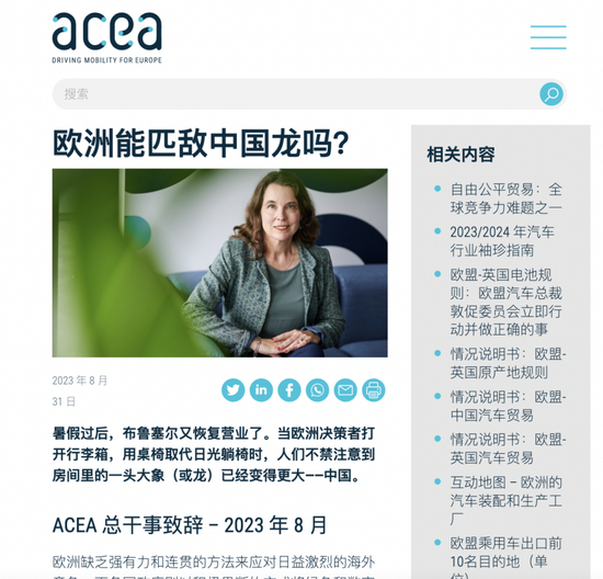 在ACEA网站8月31日刊登的文章《欧洲能匹敌中国龙吗?》的开头,作者AECA总干事西格丽德·德弗里斯用调侃的语气说,“当欧洲决策者打开行李箱,用桌椅取代日光躺椅时”,中国已经变得更强大。