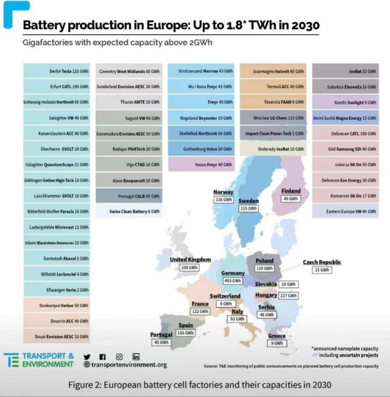 图注:欧洲2030年电池产能布局。来源:欧洲交通与环境联合会(Transport&Environment)