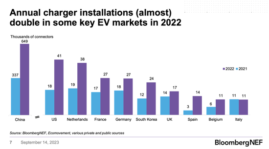 在9月26-27日于荷兰乌特勒支(Utrecht)召开的欧洲电动车大会(AEC 2023)中,彭博新能源财经展示了一组关键数据:2022年全年,中国安装了80万个充电桩,几乎与全球其他地方安装的总数一样多。