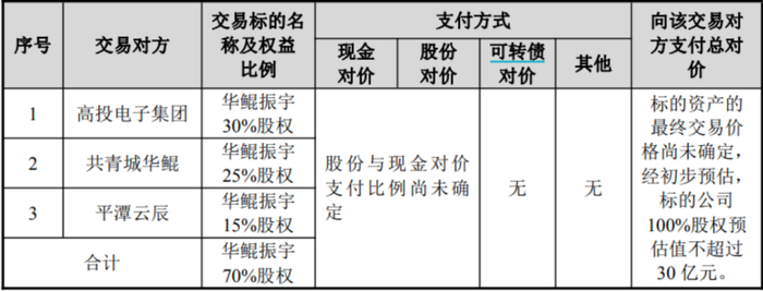 根据方案,高新发展拟通过发行股份及支付现金的方式,购买高投电子集团持有的华鲲振宇30%股权、共青城华鲲持有的华鲲振宇25%股权、平潭云辰持有的华鲲振宇15%股权。