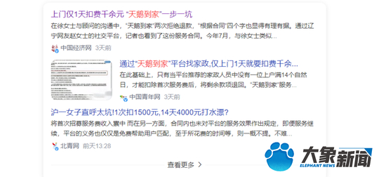 在黑猫投诉平台,记者发现有关“58到家”的投诉超过了2600条,投诉内容多为“育儿师水平不达标”“霸王条款扣高价匹配费”“未提供服务收取费用”等问题。而在网上的社交资讯平台,全国各地媒体相继报道过“58到家”不合理扣费,情况和周先生相似。今年3月,九派财经曾报道,一名北京市民投诉“58到家”在没有保姆上门的情况下依然扣了他1515元的“首次匹配服务费”。