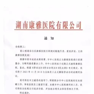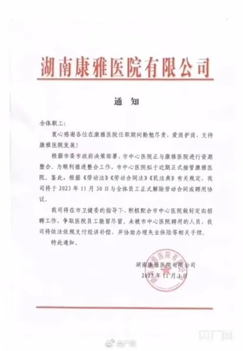 上述通知显示,根据市委市政府决策部署,市中心医院正与康雅医院进行资源整合,为顺利推进整合工作,市中心医院拟于近期正式接管康雅医院。鉴此,根据《劳动法》《劳动合同法》《民法典》有关规定,我司将于2023年11月30日与全体员工正式解除劳动合同或聘用协议。