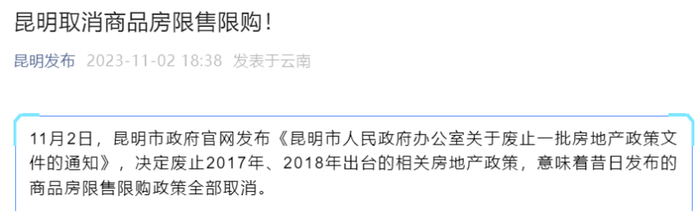 11月2日,据“昆明发布”公众号消息,昆明市政府官网发布《昆明市人民政府办公室关于废止一批房地产政策文件的通知》,决定废止2017年、2018年出台的相关房地产政策,意味着昔日发布的商品房限售限购政策全部取消。