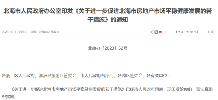 10月31日,北海印发《关于进一步促进北海市房地产市场平稳健康发展的若干措施》的通知,共提出11项措施。